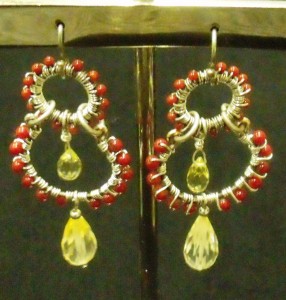 Sterling Silver Earrings with Red Coral Beads and Citrine Drops.